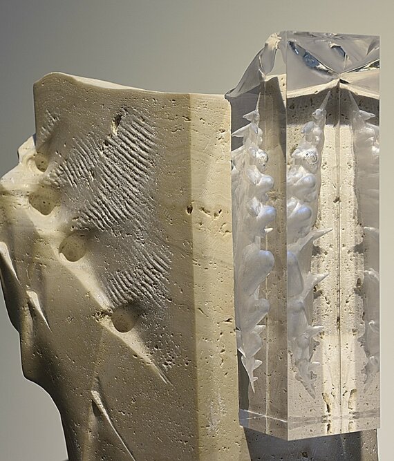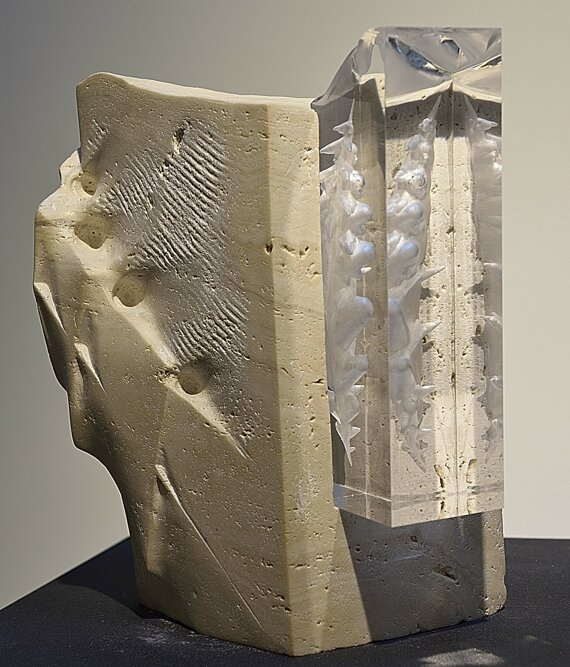 The work, of 2017, looks like a slightly twisted travertine box, stretched in the spiral movement in which is inserted a fragment of plexiglass. This is the center of everything, the point where the latent energy manifests itself and is released. When the two elements meet, a new form arises - as if it were an elusive thought made solid. The work is part of the research that I've been carrying out for the last two years and that moves around the representation of oneself. There is no center or a single reading in my research, in this sort of self-representation. We are solid and we are light together. There is not a single saying and a single form. Instead, there is a constellation of profiles and identities, of pulsating hearts in it that give voice to a choir. There is the study of partial anatomies of that human body disintegrated in several and several separate parts that so much seems to correspond to the precarious human conditions. And there is this last element of my research, the plexiglass, which give me the opportunity to express the light that is in us, through real, ancient, primordial forms. A human anatomy transfigured into a few elements or parts that then stretches and divides in the space between stone and plastic.The forms that seem and want to emerge from the nothingness of existence, visible only under the microscope, are solitary emancipations of matter without monumental stories to tell but nevertheless bearing memory. Here are our momentary lives. Here are our microscopic doubts exaggerated to the right point to make them visible, almost obvious... lonely and solidly imprisoned who want to be free.
